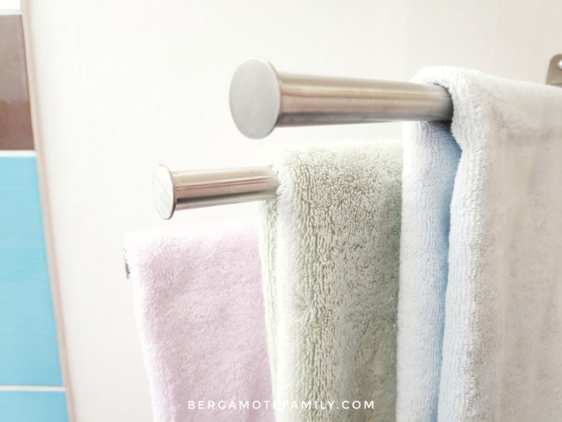 Ici, chaque enfant à sa couleur de serviette de toilette. Le choix n’a pas été simple car le site propose un choix varié de couleurs vives ou pastels. J’ai orienté le choix des enfants sur du pastel, car j’aime beaucoup ! Au final, Juliette a choisi du parme, Valentin du bleu ciel et Antoine du vert céladon.