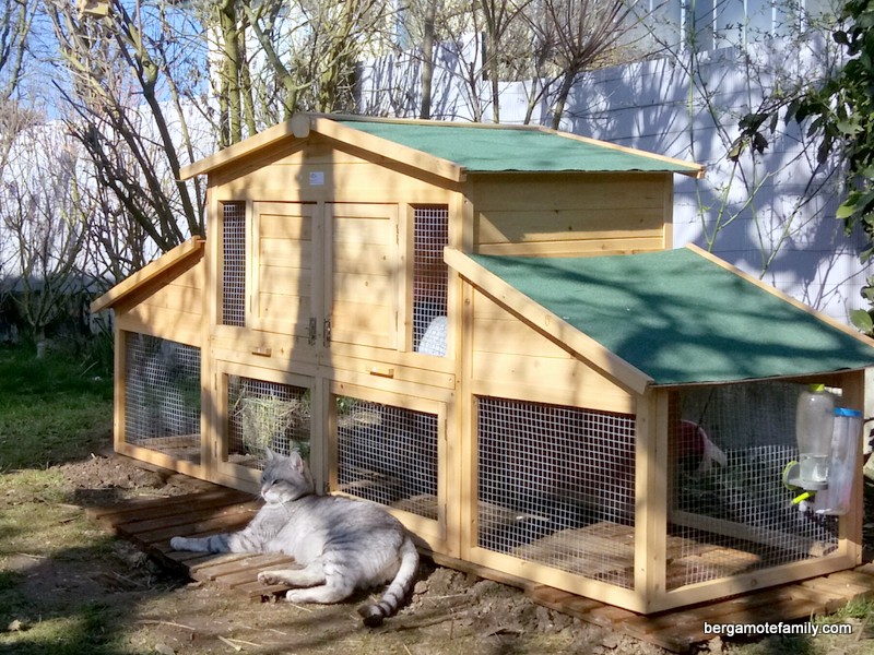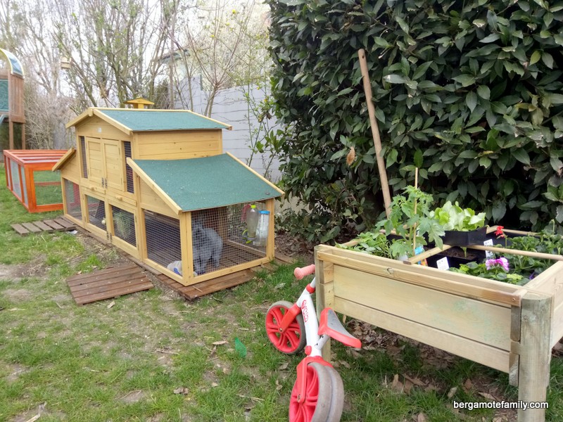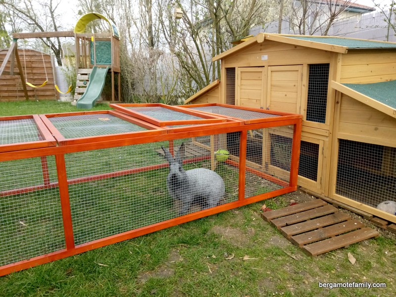 Notre lapin Biscotte est un lapin de ferme, un argenté de Champagne. Loin d’être un lapin nain, Biscotte est plus grosse que notre chat et méritait d’avoir un clapier à sa taille. Il lui faut de l’espace pour s’allonger, tout en restant abrité pour les jours de pluie, et protéger les jours venteux. J’ai opté pour un clapier XXL de 2 mètres de long. Pour qu’elle puisse avoir un accès à la pelouse, j’ai aussi ajouté une extension que je colle à l’enclos, ou bien que je sépare complètement pour que Biscotte aille manger de l’herbe ailleurs dans le jardin. A la fin de l’été, lorsque qu’il n’y a plus de légumes dans le potager, Biscotte est totalement libre dans notre jardin (en alternance avec les poules).