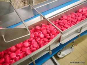 Il est temps ensuite de revêtir leur bel habit rouge, c’est le cirage (ou paraffinage). Les Babybel sont ensuite emballés, mis en filets puis en cartons et palettes pour rejoindre les grandes surfaces.