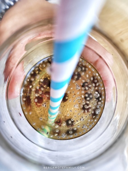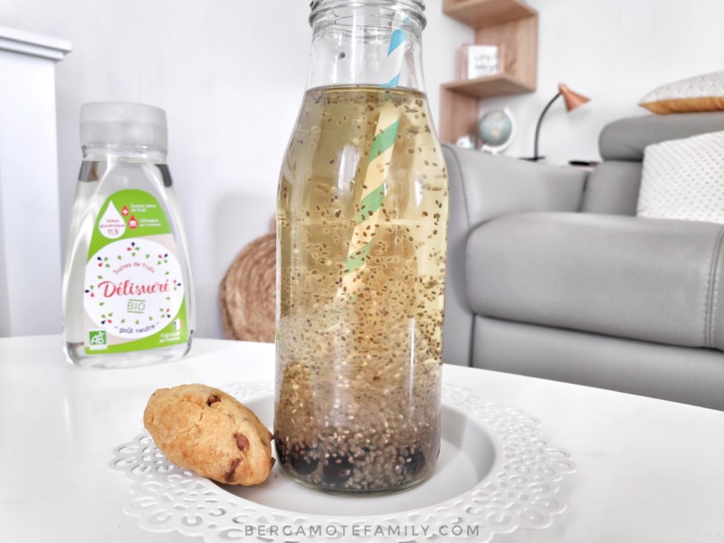 - Dans votre bouteille, mettre la moitié de l’eau avec les graines de chia. Laisser trempée le sachet de camomille avec.