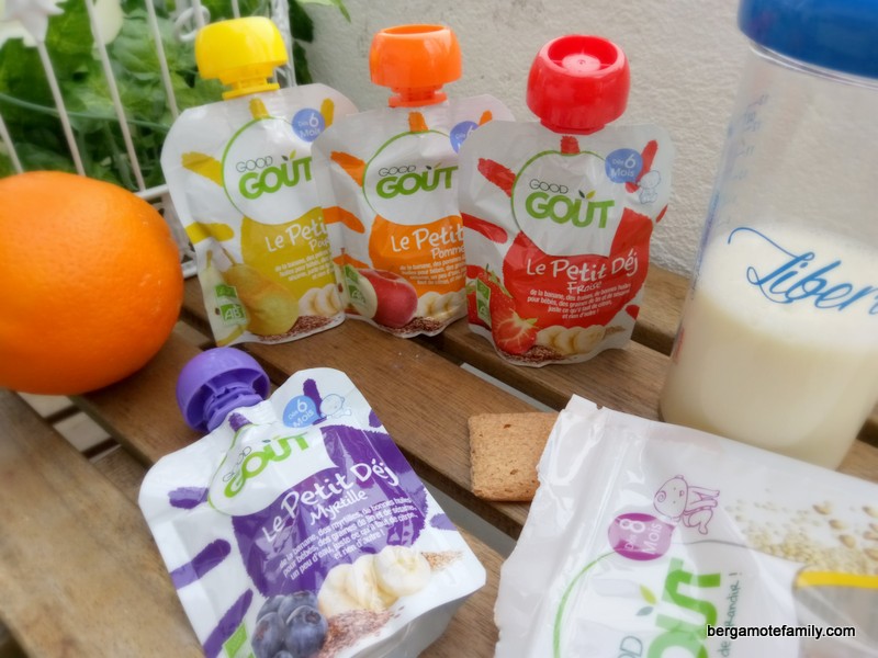 Dernièrement j’ai pu découvrir Le Petit Déj Good Goût, 4 variétés de petites gourdes de 70 ml, parfaites pour compléter le lait du matin. C’est l’équivalent du miam-ô-fruit pour bébé pour ceux qui connaissent.