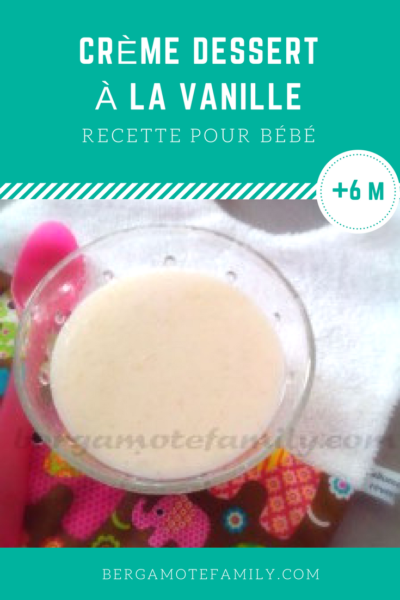 Sur la photo c’est un bavoir réalisé par L’Allumeuse de réverbères qui met en valeur ma crème dessert à la vanille pour bébé.