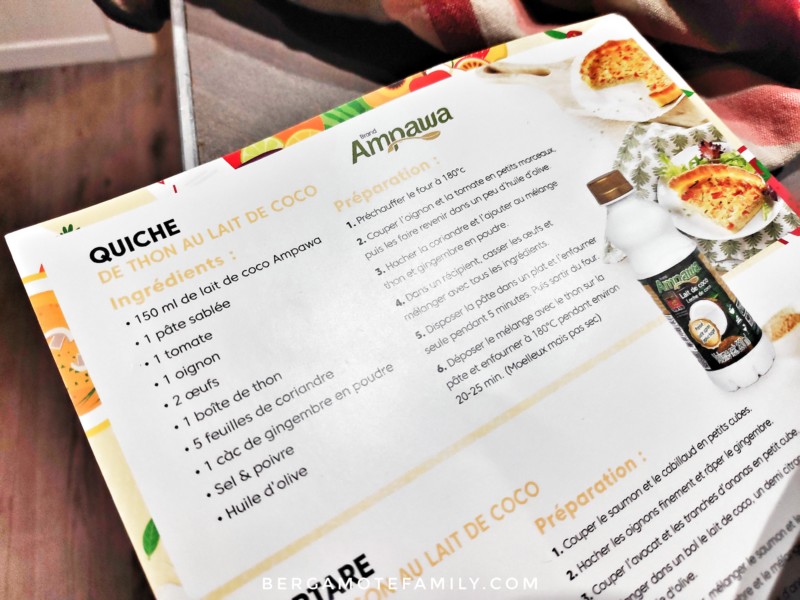 Je vous ferai un rapide inventaire de ce qu’elle contenait en fin d’article mais pour une fois, je voulais vous partager l’une des recettes fournie avec la box, parce que franchement : c’était très bon ! Il s’agit de la quiche au thon au lait de coco, un vrai régal !