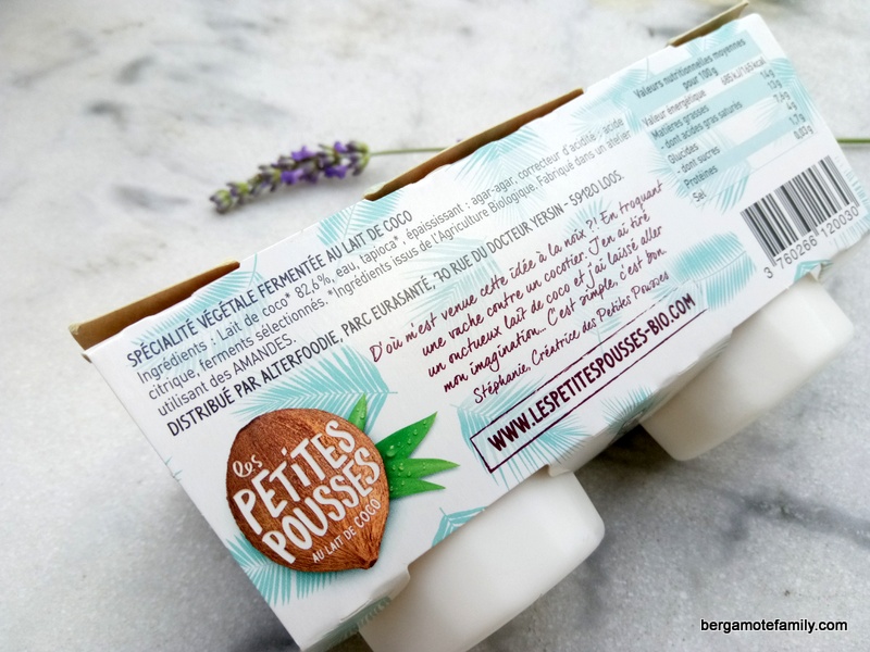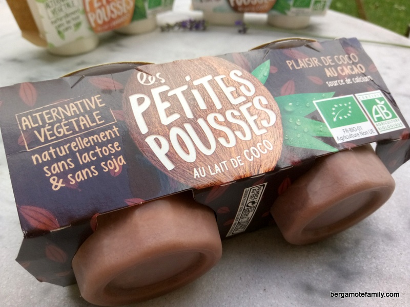 Les Petites Pousses, c’est une marque de vrai-faux yaourts bio aux laits végétaux. On trouve la gamme au lait de coco, très onctueuse avec une variété nature, une cacao et une aux framboises, et la gamme au lait d’amande, nature ou framboises.