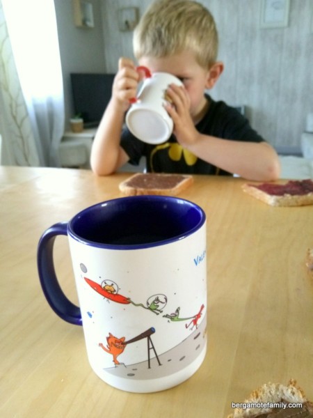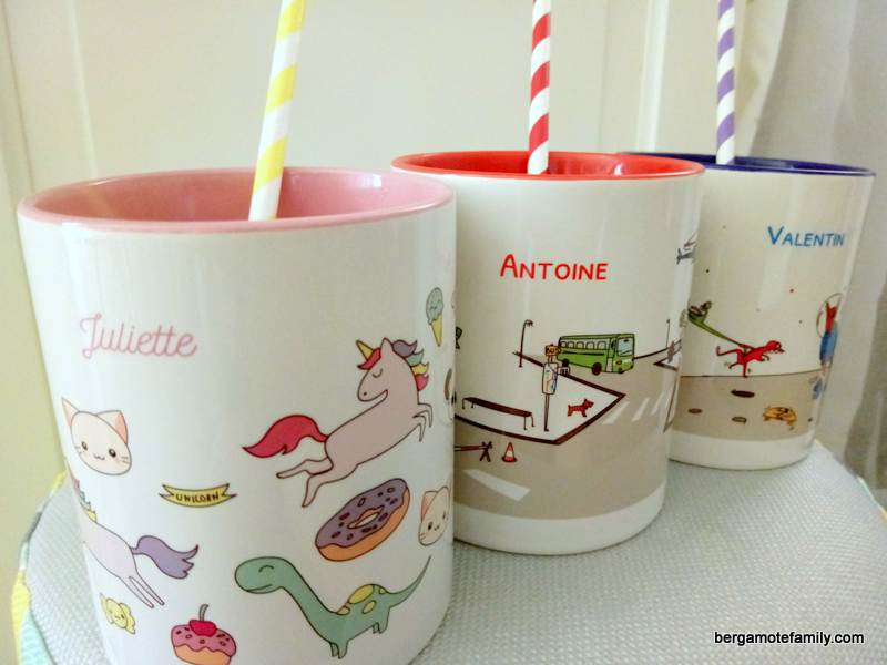 Ma grande fille prenant un verre ou une tasse de lait le matin, les garçons l’imitent. Mais attention, chacun sa tasse ! Une tasse qui casse en plus, comme papa et maman. Avec leur prénom, leur choix de motif, leur couleur. Elles viennent de chez C-monétiquette, elles sont personnalisables, c’est sympa je trouve.