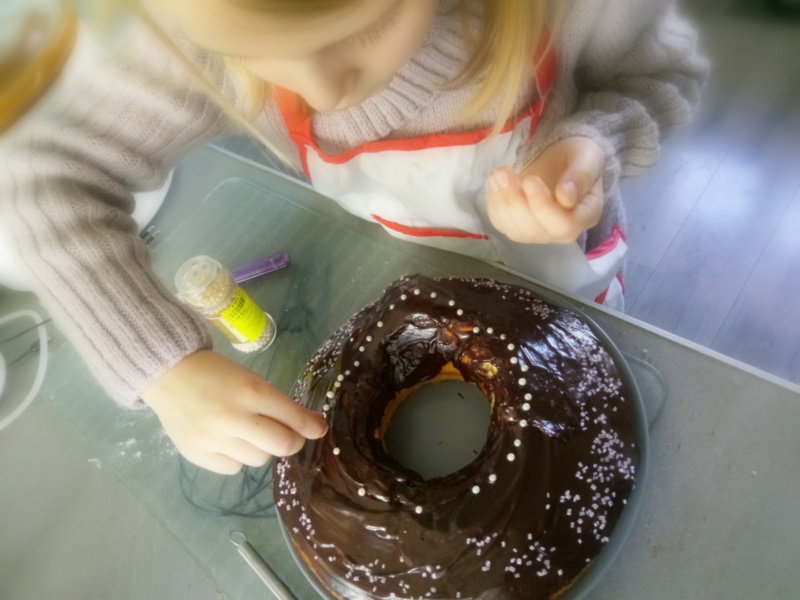 J’ai réalisé ce gâteau avec ma fille de 7 ans, quasiment autonome sur toutes les étapes de préparations. C’est la première fois d’ailleurs qu’elle fait un glaçage au bain-marie et elle s’en est sorti comme un chef ! Evidemment, la partie qu’elle a préféré dans la confection du gâteau, c’est d’y mettre le décor (et de lécher la cuillère de chocolat !)