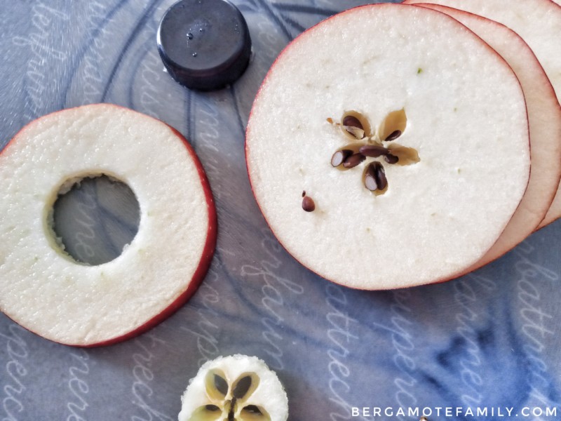 - Faire un trou au centre pour retirer les pépins et donner la forme du donut. L’astuce est d’utiliser un bouchon de bouteille comme emporte-pièce.