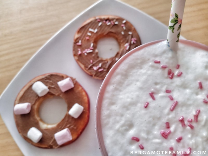 Pour compléter ce goûter, en plus des 2 donuts de pomme, chacun de mes enfants a pu avoir son verre de lait (lait + mousse de lait faite avec un mousseur à lait Cremio de Mellita) et une madeleine. Il n’ont fait qu’une bouchée des donuts !