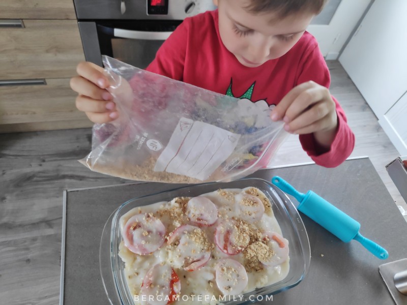 - Déposez les bouquets de légumes dans un plat à gratin. Versez dessus la sauce béchamel puis parsemez de biscottes préalablement émiettées. Pour les émietter, je les glisse dans un sachet congélation, puis je les écrase avec un rouleau à pâtisserie.