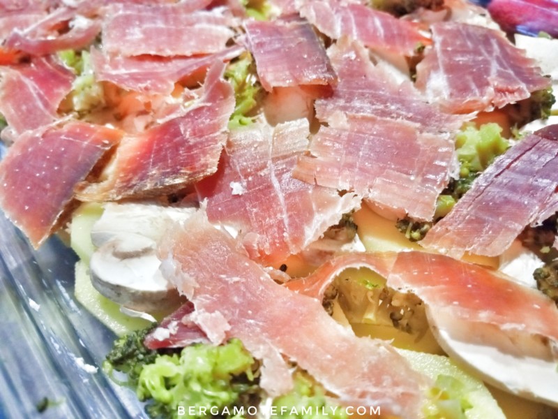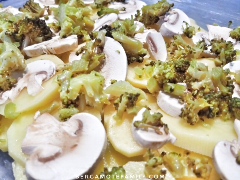- Alterner une couche de pomme de terre, des champignons, du brocoli, du jambon… la dernière couche en surface sera des pommes de terre.