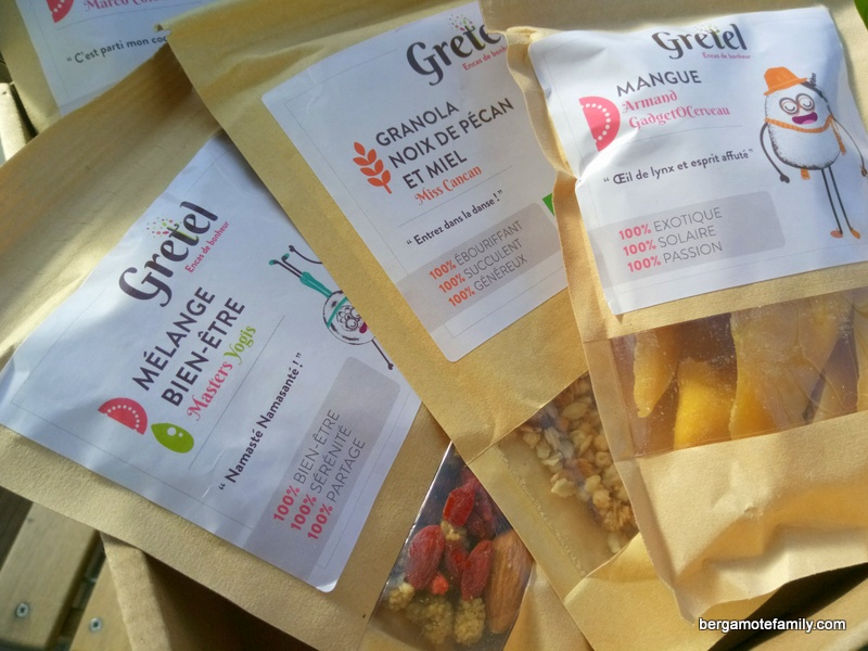 Personnellement, je suis partie sur des saveurs sucrées, car je craque surtout sur les bonbons des enfants (oups !) et que cela me permet de les remplacer par un en-cas sain ! Et puis aussi parce que je trouve ça génial de pouvoir varier mes petits déjeuner heathly grâce aux produits de la Gretel Box ! Mes flocons d’avoines et mes yaourts (ou équivalent végétal !) sont bien heureux d’être mélangés à des produits savoureux. Car oui, niveau goût, c’est juste parfait ! Les produits sont frais, ça se sent (pas comme ceux qu’on peut trouver en boutique dans les distributeurs qui sont parfois là depuis un moment…). En plus, les sachets sont refermables pour une conservation optimale.