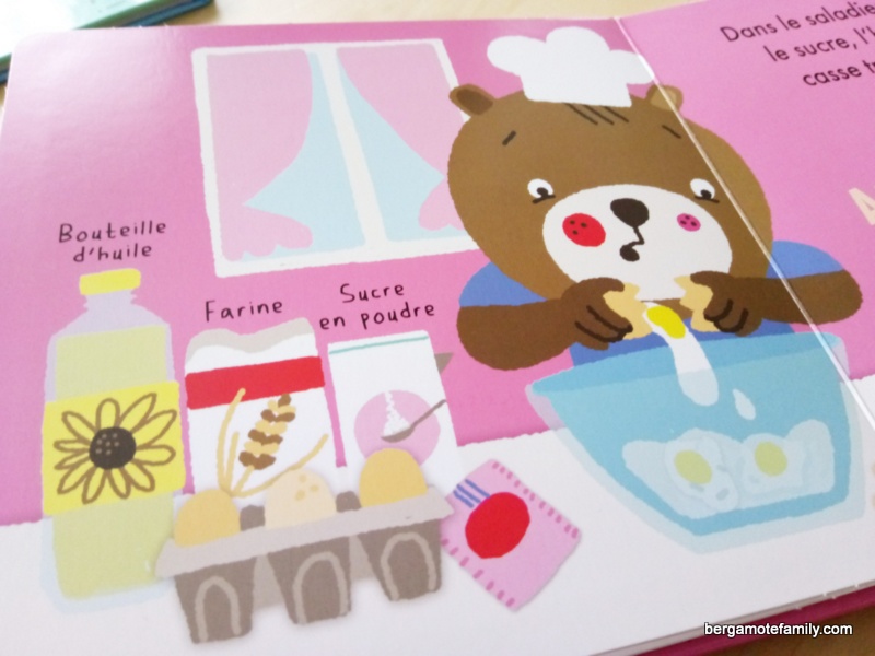 Toujours dans la même collection « comme les grands », cette fois-ci c’est un ourson qui enfile une toque pour réaliser un gâteau au yaourt dans « je cuisine ». Comme dans le précédent livre, chaque page apporte du vocabulaire nouveau avec l’imagier sur la page de gauche et un son de cuisine : casser les oeufs, mélanger avec le batteur, éplucher avec l’économe… Là encore, les enfants adorent découvrir les sons ! Ce livre-là vous délivre même la recette du gâteau au yaourt, ce qui permet de la refaire avec ses enfants en suivant les pages du livre. J’ai trouvé ça chouette !