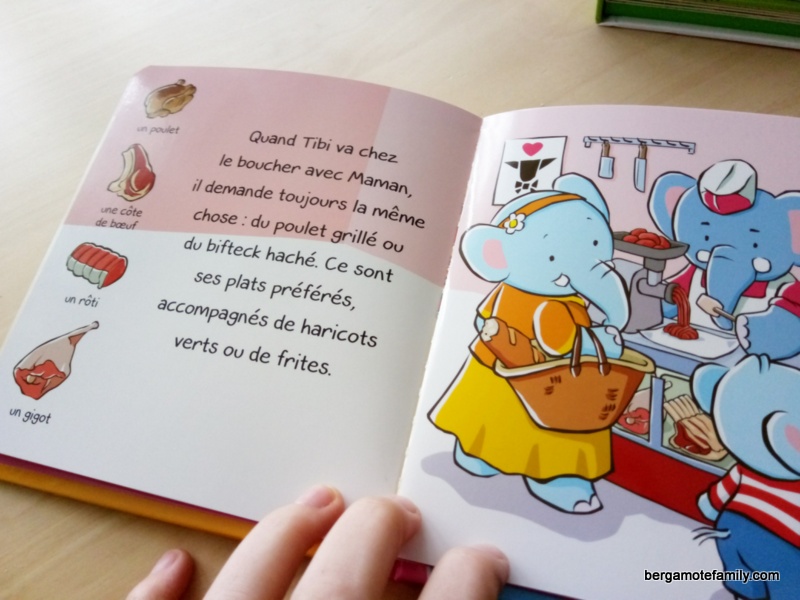 Le dernier ouvrage que je vous présente, c’est « Tibi mange de tout ». Tibi est un éléphanteau qui va faire des courses avec sa maman. On va donc découvrir les différents étals (marchand de légumes, boucher, poissonnier, charcutier, …) au cours d’une histoire. Ce livre aborde des points auxquels les parents sont confrontés : découvrir un nouveau légume par exemple ! Il délivre aussi quelques messages nutritionnels comme boire un jus d’orange pressé pour être en forme et parle de la saisonnalité (les cerises et les fraises en été). Mais Tibi est gourmand, comme tous les petits enfants, alors on y parle aussi frites, mayonnaise, chips, glaces et pâtisseries ! Bref, mes garçons s’y retrouvent bien !