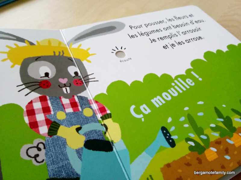 Dans la collection « comme un grand » de Fleurus, il y a « je jardine » ! C’est un livre sonore où l’enfant va appuyer à chaque page sur un capteur afin d’enclencher un son en rapport avec l’image. L’enfant suit le personnage, un lapin, qui va bêcher, ratisser, planter, arroser fleurs et carottes, mais également tondre le gazon, tailler les arbres et les rosiers, ramasser les feuilles… A chaque page, il y a du nouveau vocabulaire à découvrir : bottes, binette, sécateur, arrosoir…. et un son à écouter.