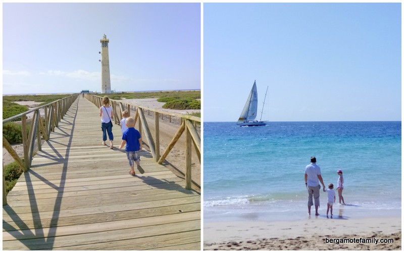 Ce qui est bien aux Canaries, c’est qu’il est facile de se déplacer, même avec une poussette. Il y a des bus qui font toute l’île, et des taxi (avec des sièges auto pour les enfants, pas du tout aux normes et carrément vieillots, mais on s’en contente). Ainsi, on a pu aller à Morro Jable, voir le phare de la plage et les longues plages de sable blanc ! Si on avait pas eu les enfants, on serait allé pied jusqu’au bout de Fuerteventura, voir l’autre phare dans une zone plus reculée et moins touristique. Mais les enfants ont préférés faire des châteaux de sable, et barboter !