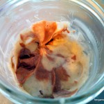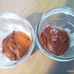 - Verser la pâte au cacao dans les deux pots à confiture de manière égale. Faites de même avec la pâte vanillée. Donner un ou deux coup de cuillère pour lier les deux pâtes mais sans mélanger.