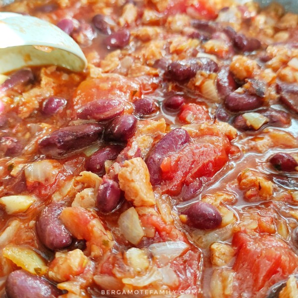 - Ajouter dans la poêle le contenu du bocal de tomates pelées, les haricots rouges rincés, et l’émietté de soja. Assaisonner. Laisser mijoter 20 minutes environ.