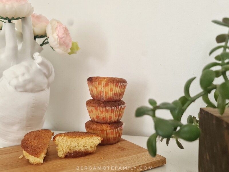 Je débute donc avec des quatre-quarts en portions individuelles (ça évite de tout manger en un goûter par gourmandise !) dans lesquels j’ai mis de la confiture de fraise home made offerte.