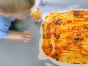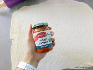 Les enfants sont ravis de participer à l’élaboration de la recette ! Pour faire ultra-simple et rapide, j’ai tartiné ma pâte à pizza avec la sauce tomate Chou Kale de chez Maison Prosain. La sauce est super généreuse en chou kale, comme vous le verrez sur les photos. En plus, elle est bien parfumée !