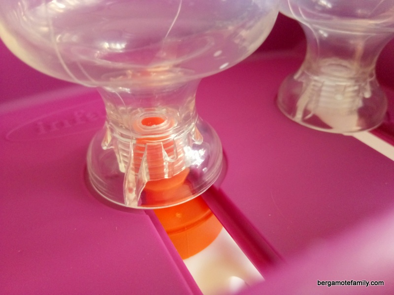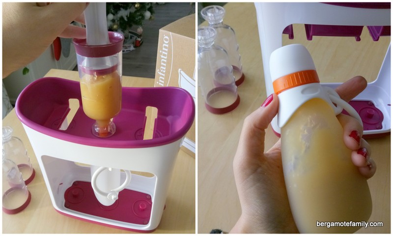 Petit conseil avec les gourdes réutilisables d’Infantino : Lorsque vous les placer dans la Squeeze Station, dévissez un peu la bague orange pour que l’air puisse s’échapper, sinon, cela sera sous pression, et gare aux projections ! Le plus souvent, je fais carrément un vide d’air en empoignant la gourde au moment où je verse la compote dans le tube et que je place le poussoir 😉