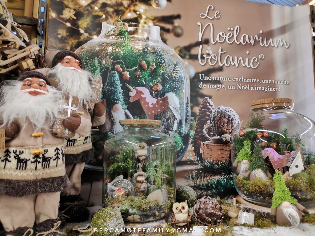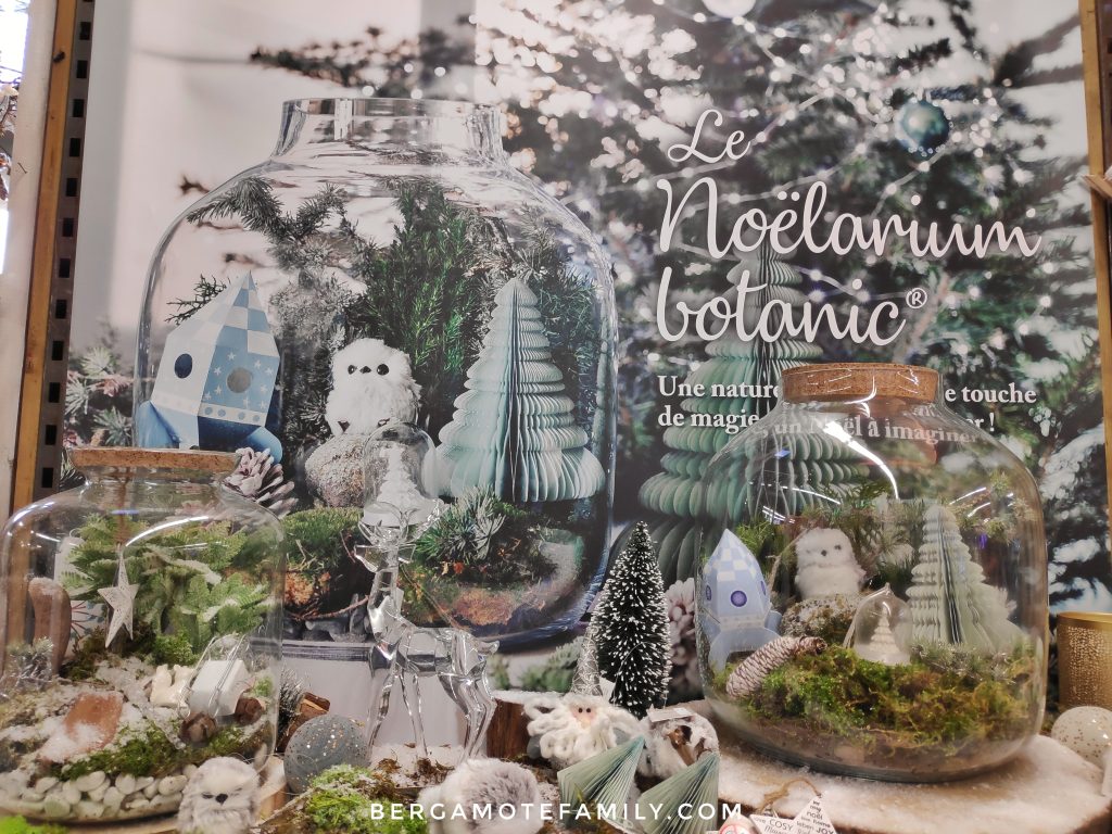 La boutique proposait 6 Noëlarium dans 3 thèmes différents (traditionnel, nordique ou nature), que j’ai pris le temps d’observer afin d’être inspirée et d’avoir une idée concrète du matériel à acheter. Beaucoup de mousse, branchages, morceaux de bois… Et des figurines ou boules de Noël en verre : des petits animaux, champignons, … Botanic dispose juste sous leurs modèles les produits nécessaires à leur composition, mais rien ne vous empêche d’aller dans les rayons pour faire un Noëlarium qui vous correspond.