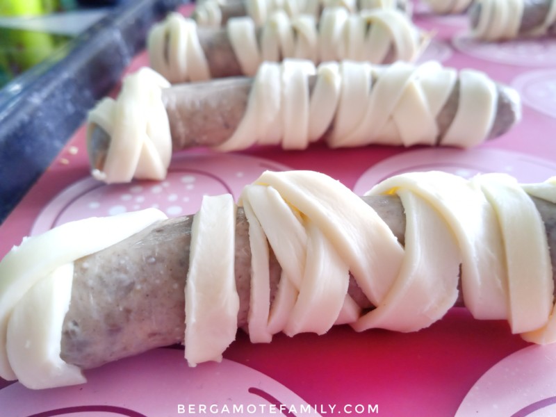 - Enrouler les bandes de pâtes autour des saucisses en veillant à laisser un espace vers le haut pour « le visage » de la momie.