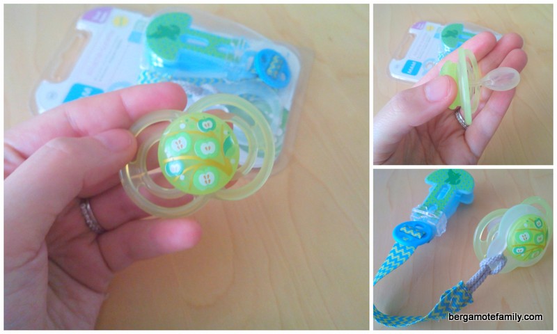 Et pourtant, cette tétine, elle n’a rien d’exceptionnel. Enfin, c’est quand même une MAM Perfect, comme il les aime, avec l’attache tétine réglable qui va avec. Elle est conçue pour réduire le risque de mauvaise disposition des dents et puis le col de la téterelle est bien plus mince et souple que les autres sucettes (système Dento-flex). Elle n’est même pas bleue, sa couleur préférée, mais verte, avec des petites pommes dessus. Je crois que mon fils n’a jamais autant pris soin d’une sucette ! C’est fou comme il s’y accroche.