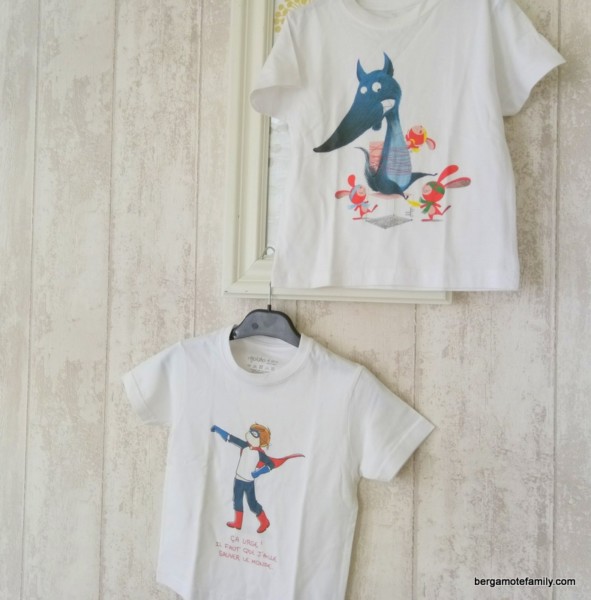 Et mon petit dernier porte le tee Shirt Loup, signé Philippe Jalbert. C’est un illustrateur et auteur de livres jeunesse. Avec ses petits lapins masqués qui attachent le loup à une chaise, il est superbe je trouve ! Bon, il est encore un peu grand pour mon loulou, mais d’ici l’été ça ira sûrement ! Il faudra que je refasse des photos 🙂