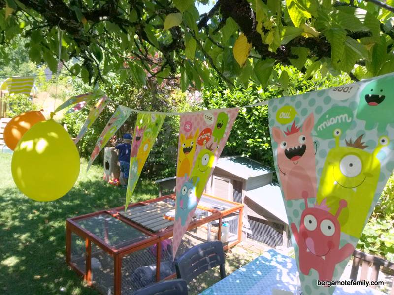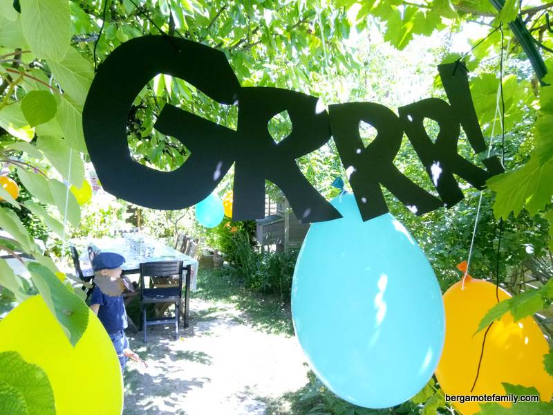 J’ai aussi trouvé de quoi décorer le jardin avec une guirlande de fanions et une autre où est inscrite Grrr pour entrer dans la zone festive ! J’ai ajouté quelques ballons et le tour est joué ! Je trouve le rendu gai et coloré, parfait pour mes petits garçons !