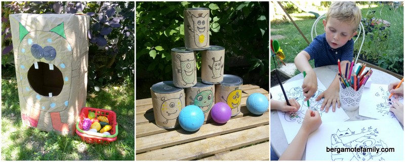 - un chamboule-tout avec des conserves récupérés, du papier kraft et quelques feutres pour dessiner des gentils monstres.