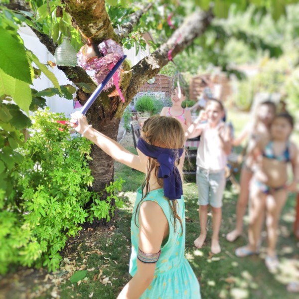 Cette année, j’ai innové en proposant une pinata. Je craignais qu’à 10 ans, les filles trouvent cela un peu kitsch, mais pas du tout!! Elles ont adoré guider Juliette jusqu’à la pinata et galérer pour l’exploser. D’ailleurs, elle a fini par l’ouvrir en la déchiquetant avec ses mains…