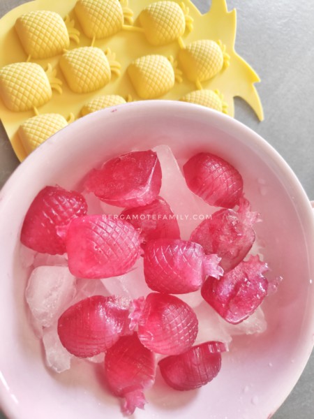 J’avais également acheté des Mason Jars dénichées chez Action pour trois fois rien pour profiter d’un bar à cocktails. Pour cela, on a acheté des jus de fruits (banane, goyave, ananas-noix de coco, mangue et j’ai également fait une citronnade-orangeade. Pour parfaire le tout et apporter de la couleur, j’ai fais des glaçons à base de sirop de grenadine (version sans sucre!) dans des moules en forme d’ananas.